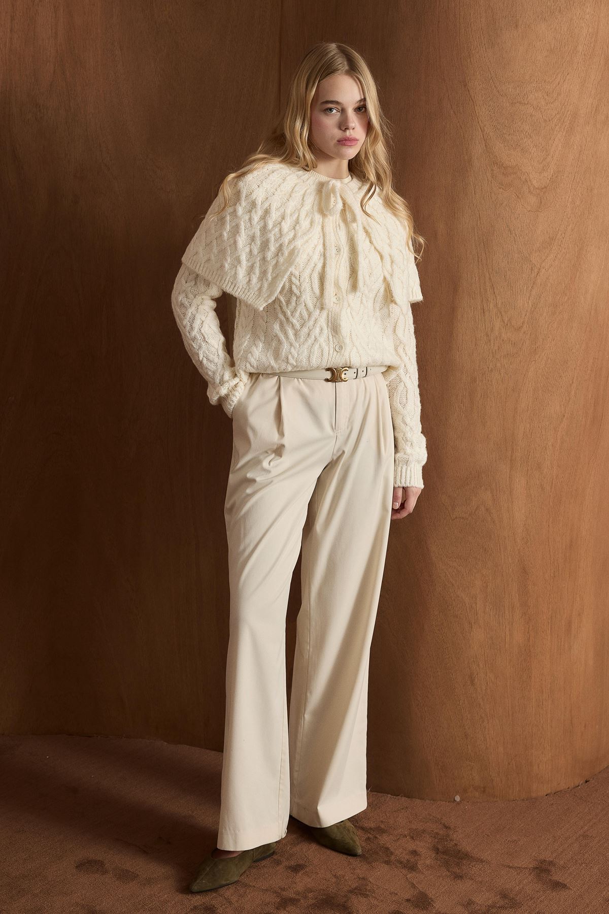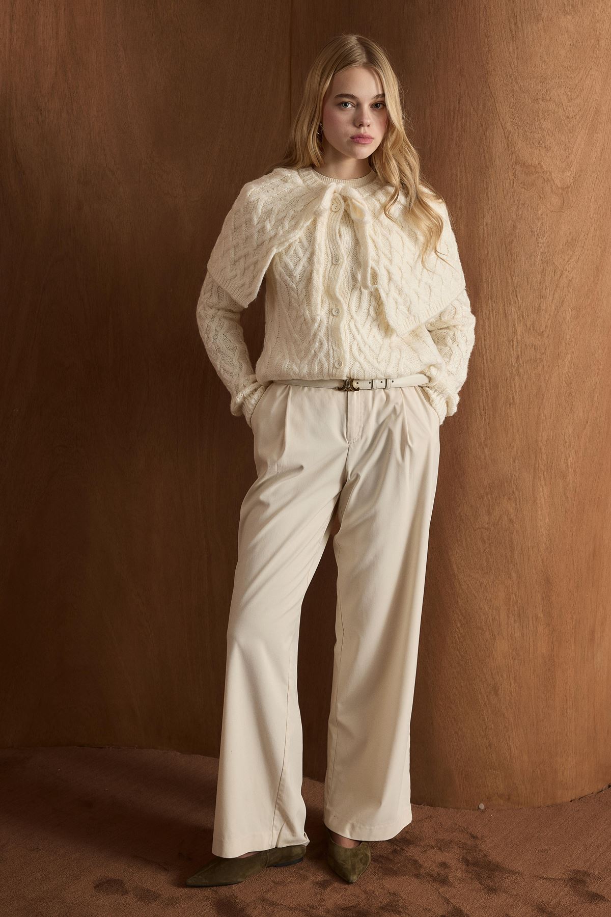 Örgü Desenli Düğmeli Triko Hırka-Ekru