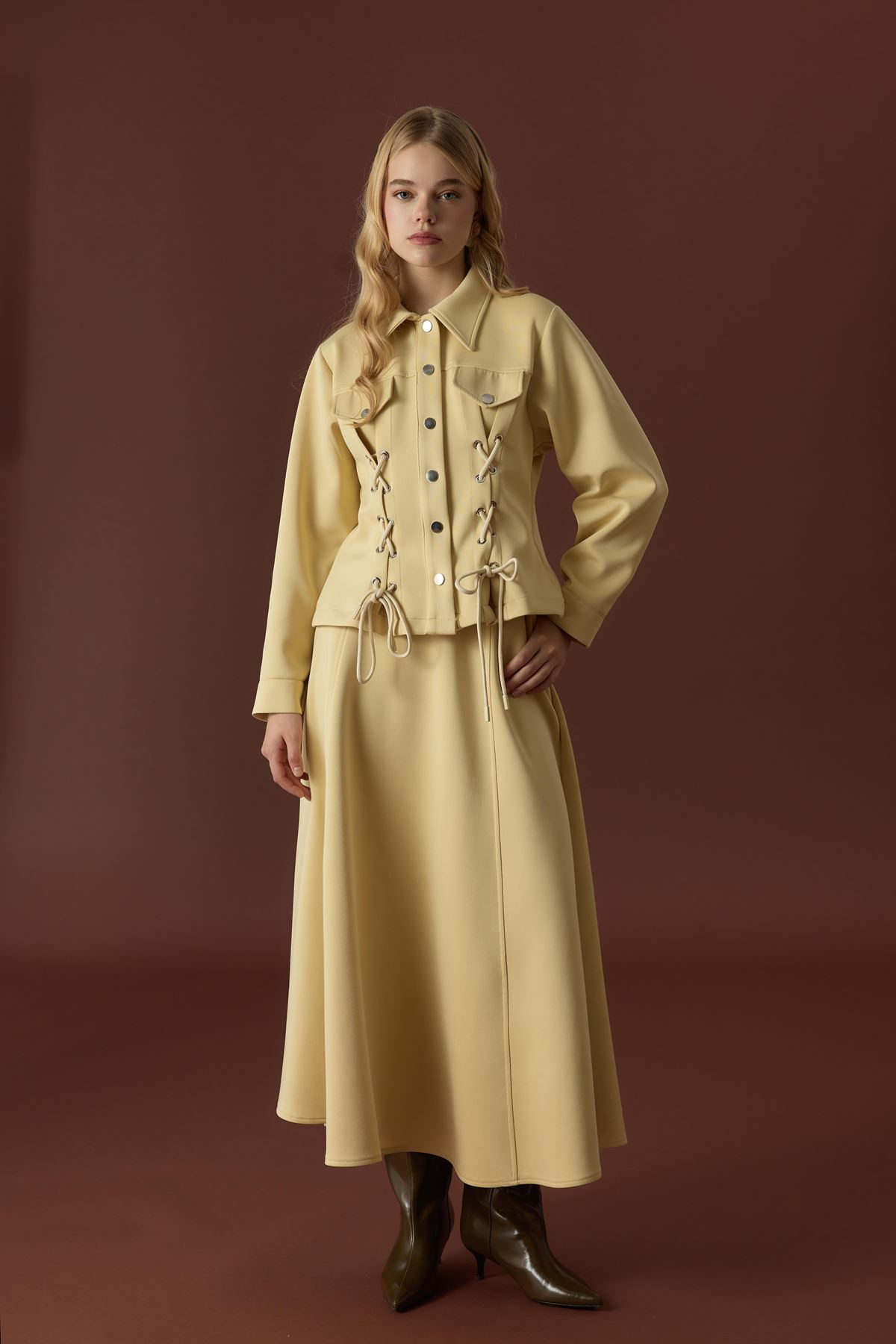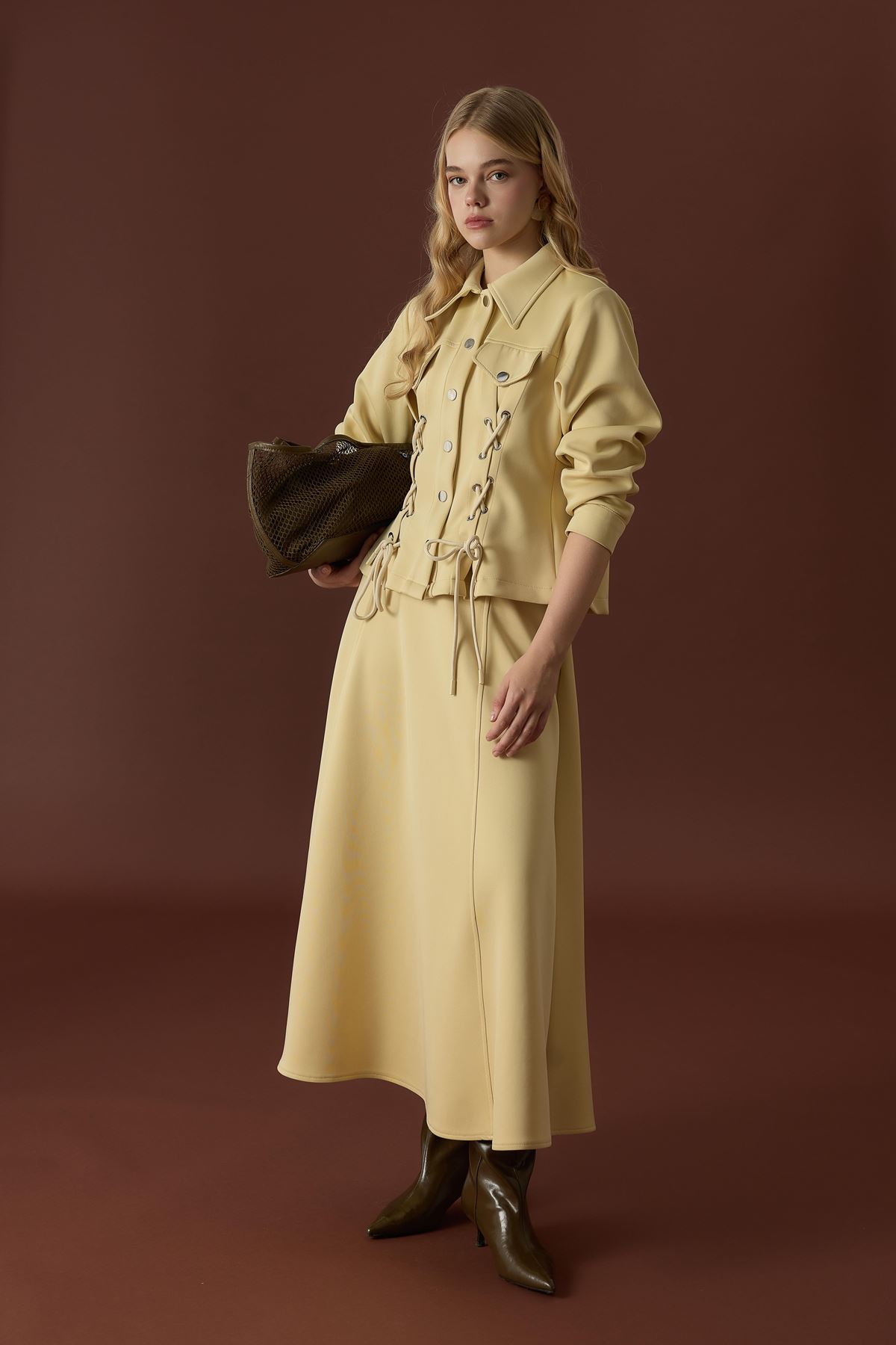 • Ön kuşgözü bağlama detaylı tasarım, çıt çıtlı, manşetli