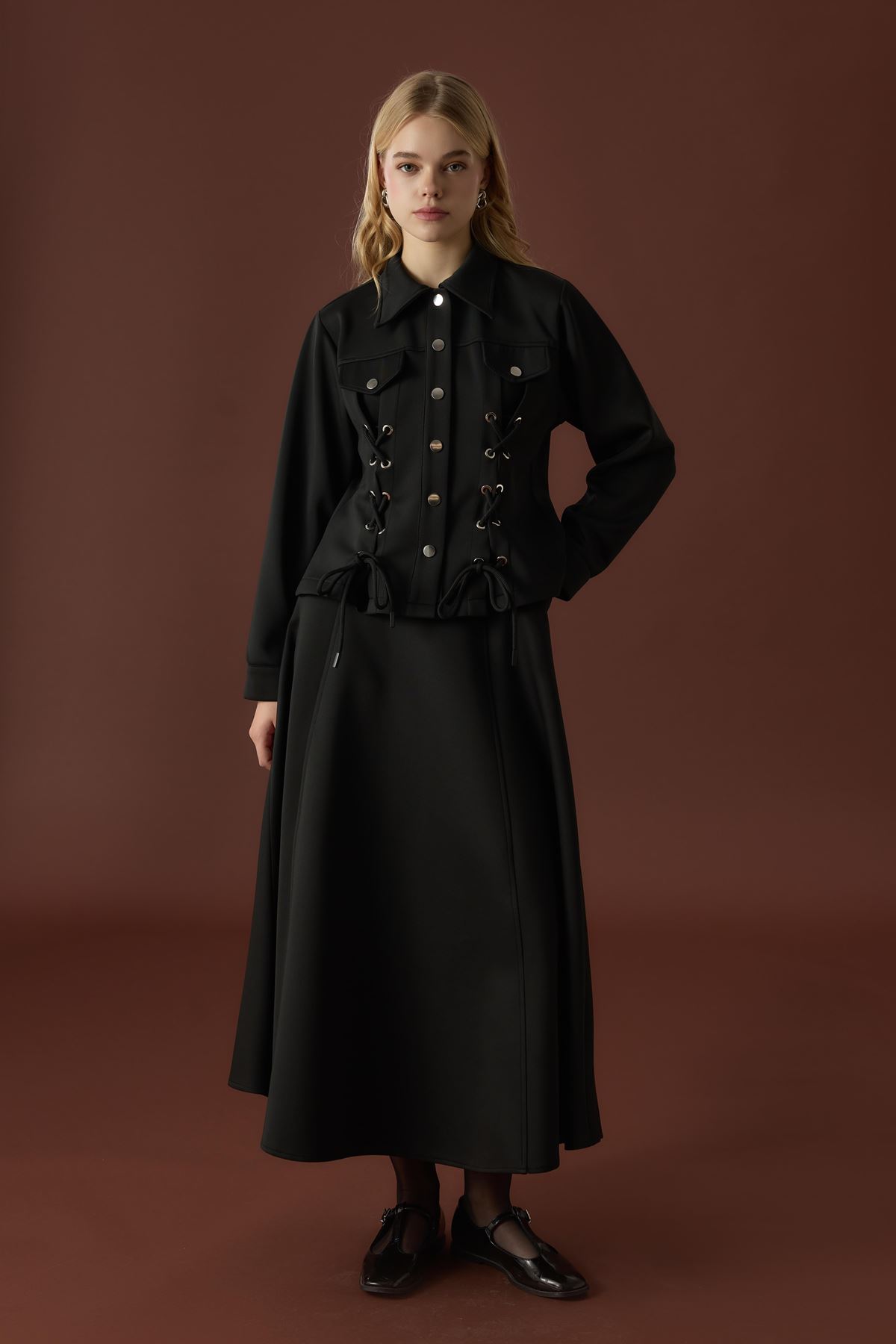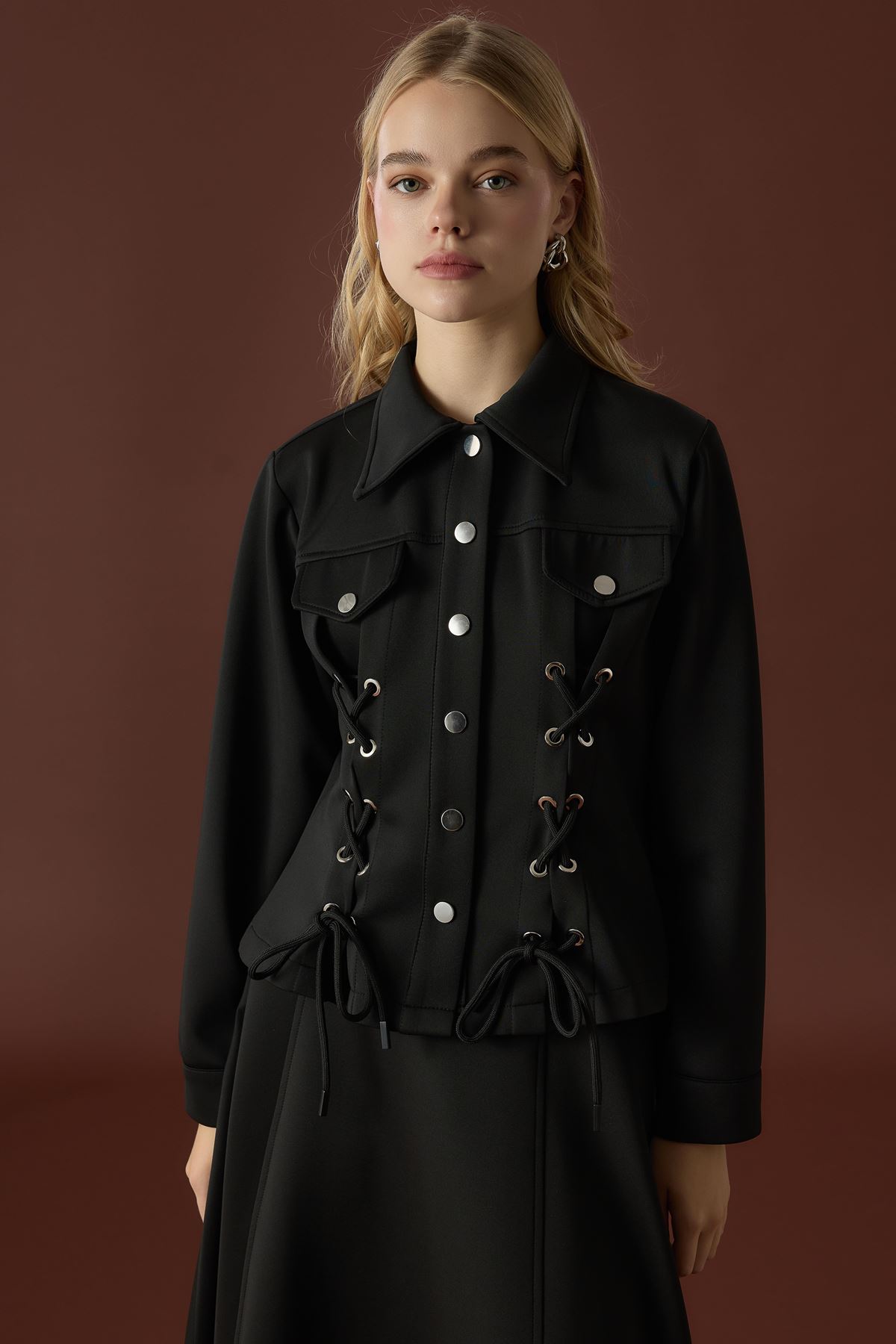 • Ön kuşgözü bağlama detaylı tasarım, çıt çıtlı, manşetli