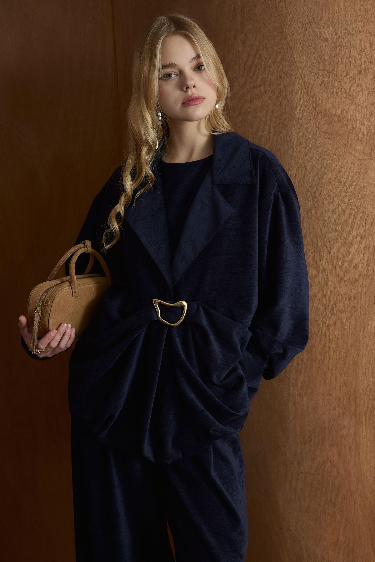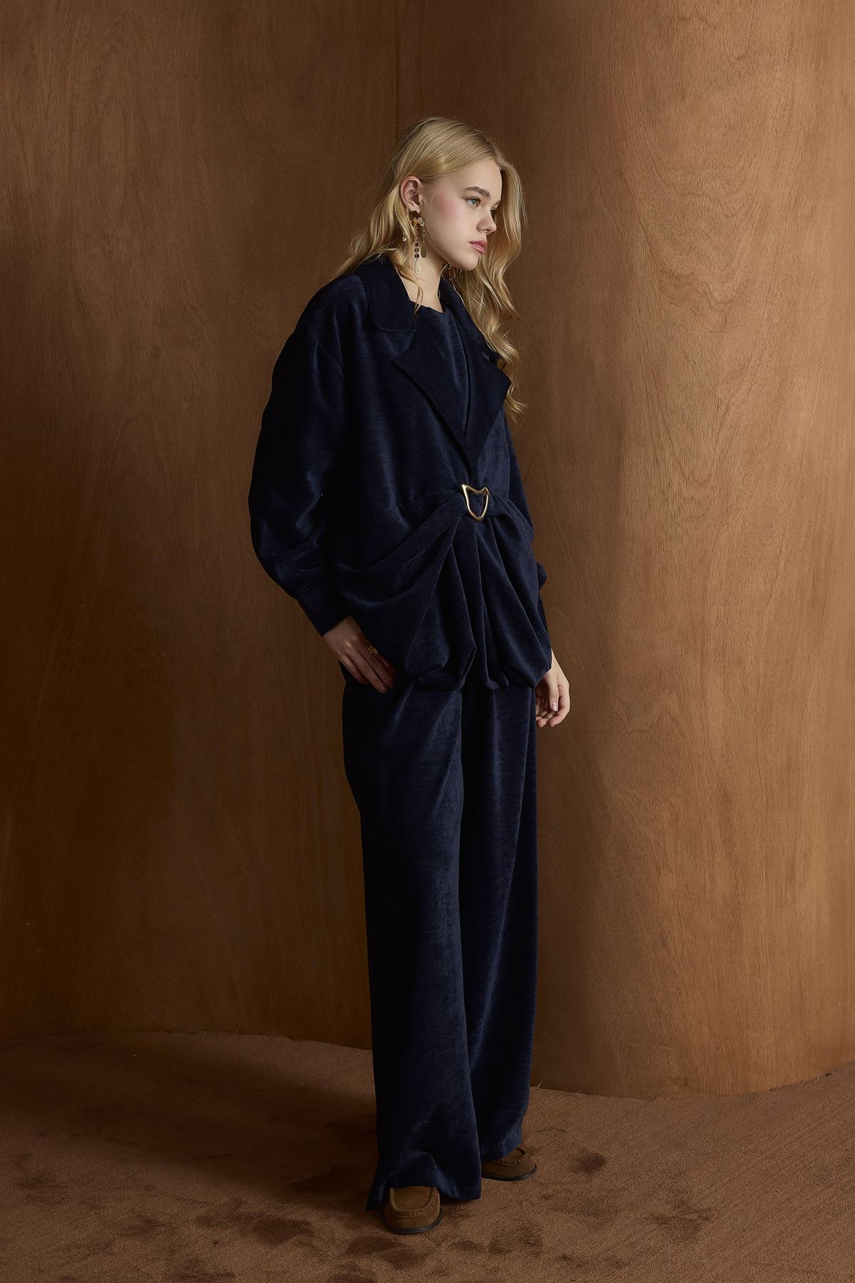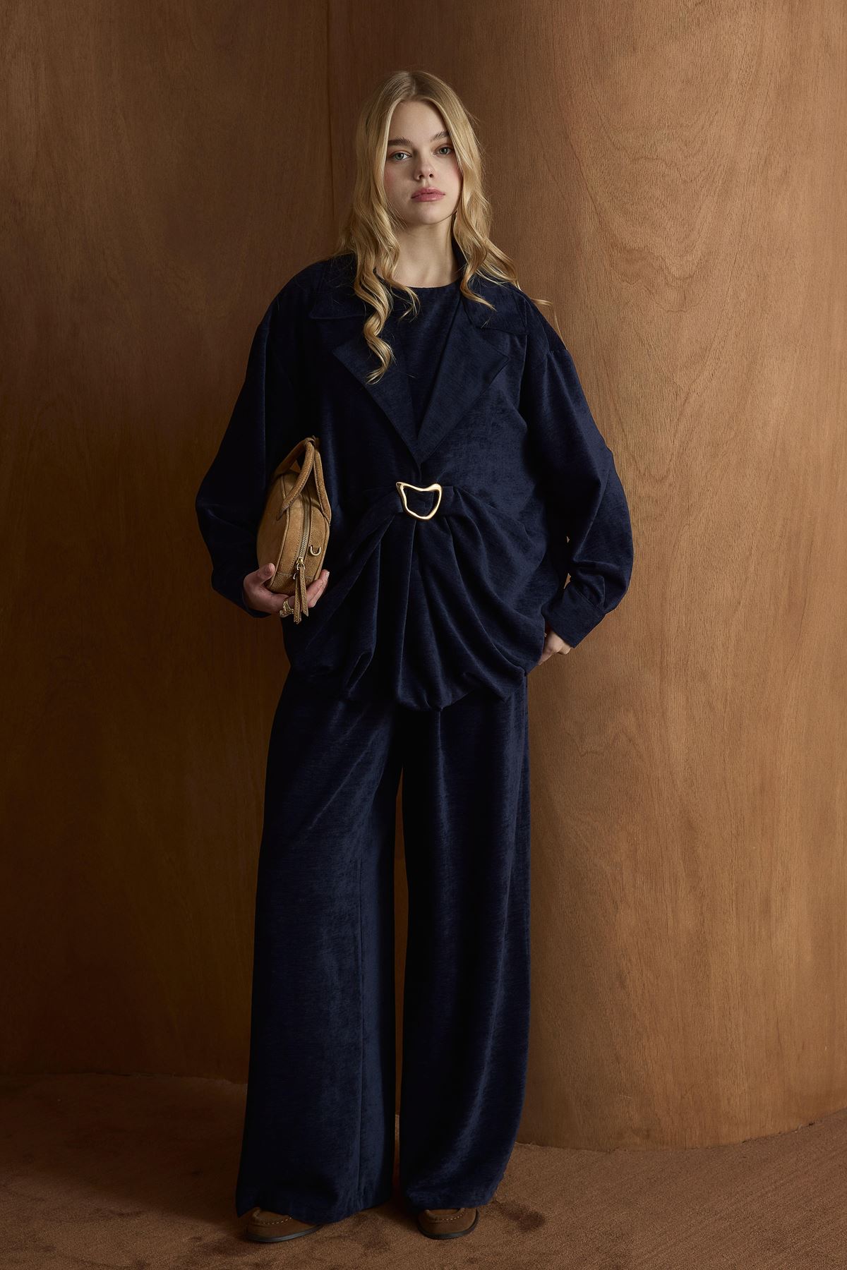 Musleya Önü Pileli Kadife Takım - Lacivert