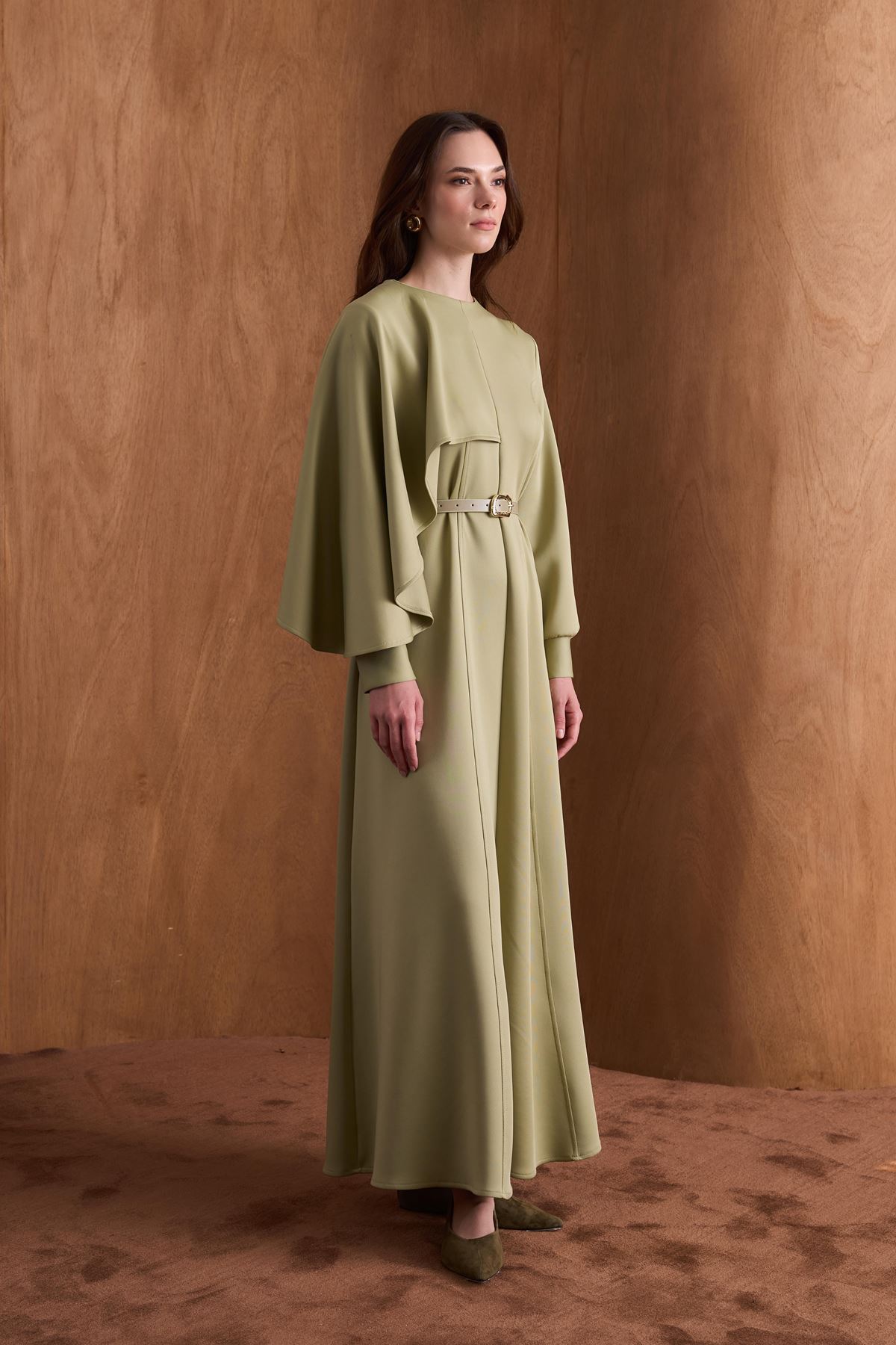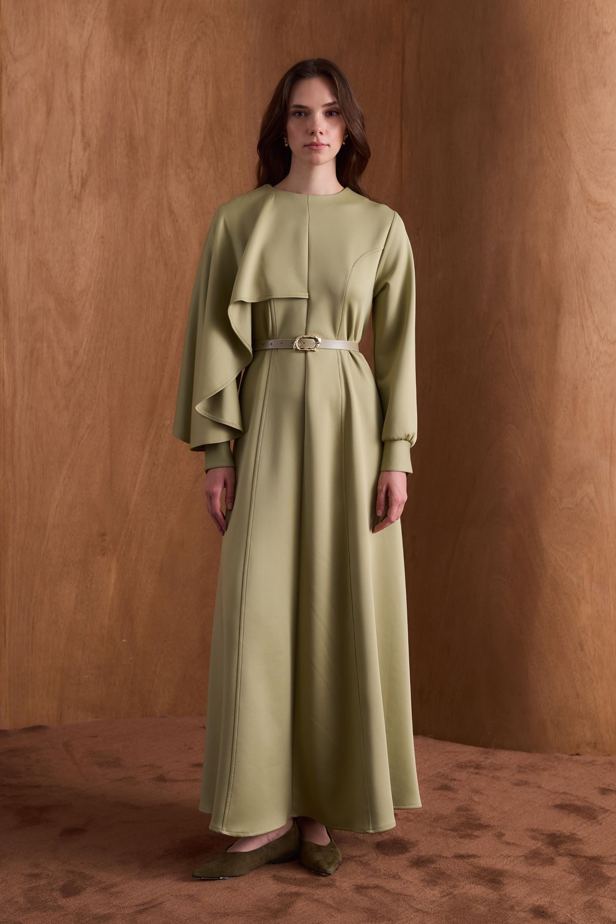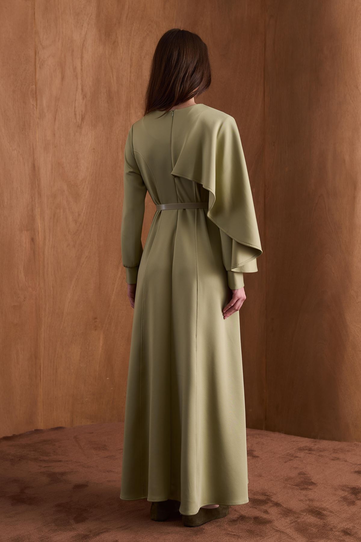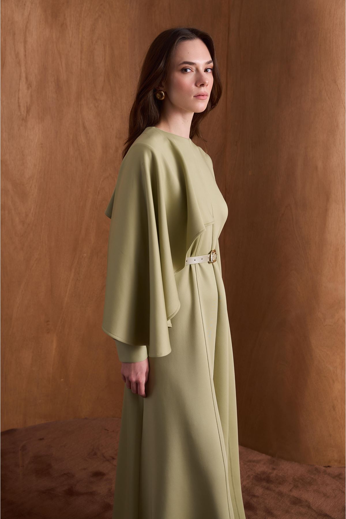 Amelie Omuzdan Şallı Scuba Elbise-Çağla