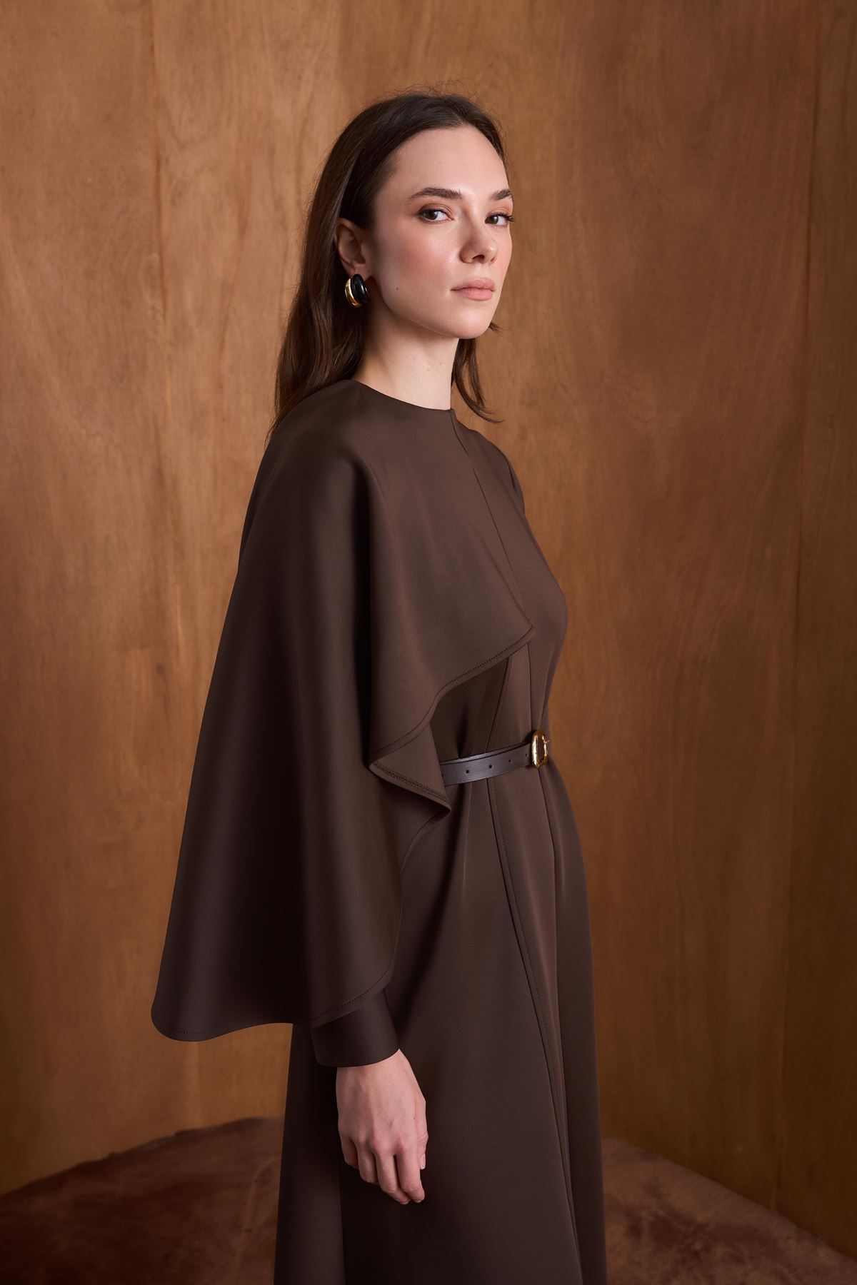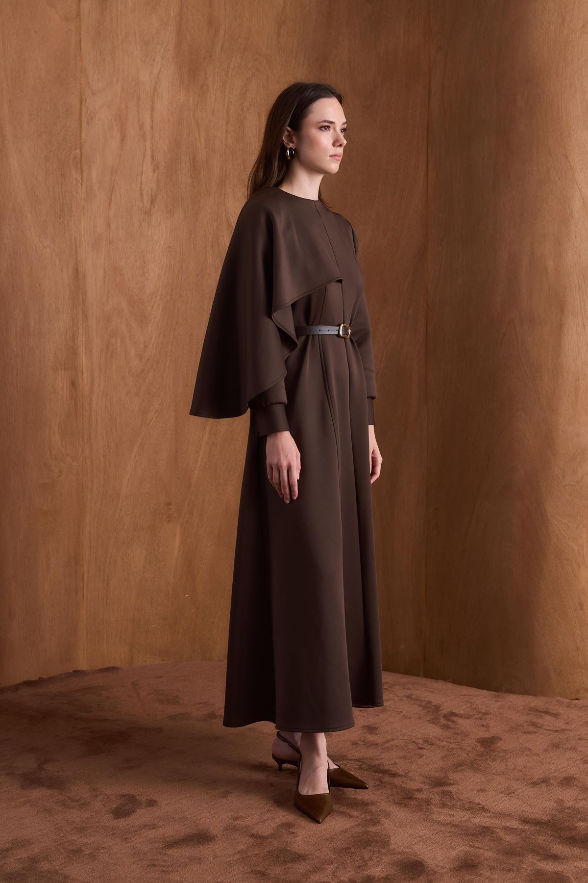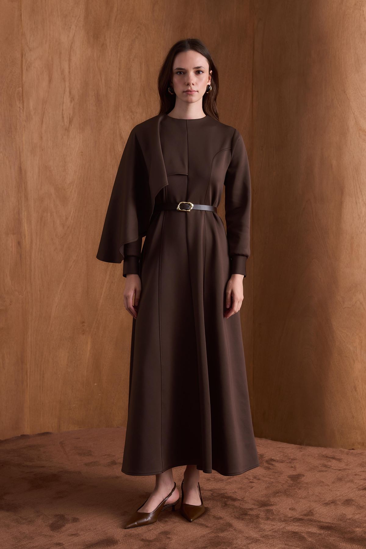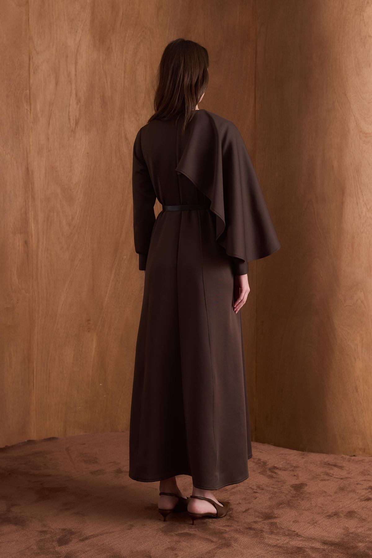 Amelie Omuzdan Şallı Scuba Elbise-Kahve
