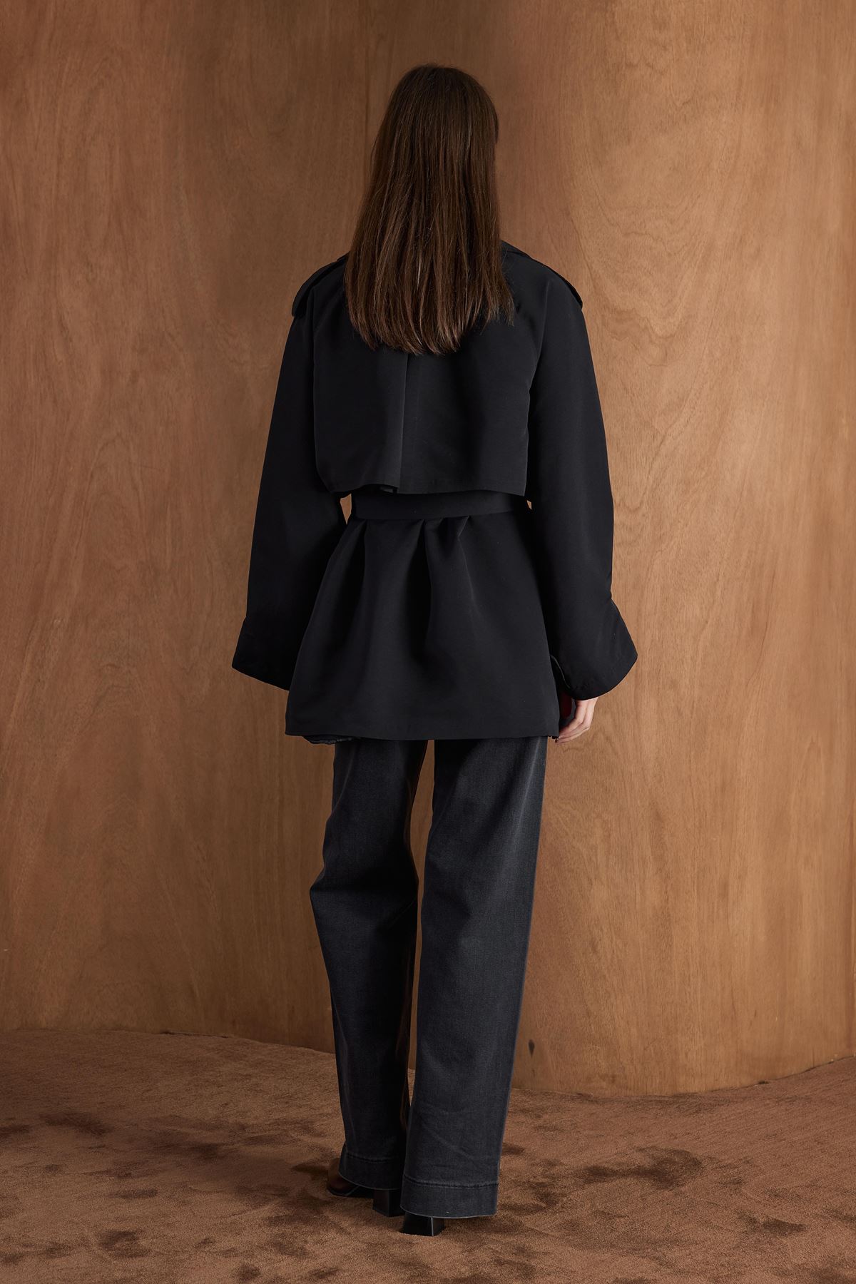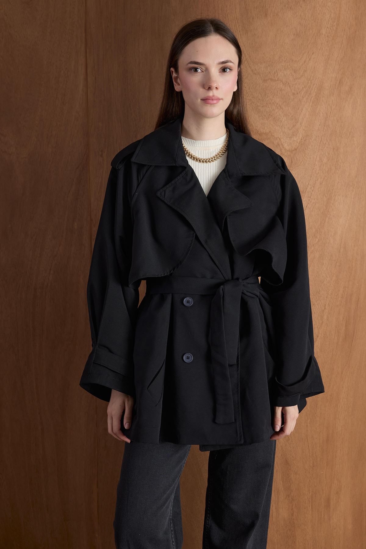 Klasik trençkot çizgilerini modern bir kesimle buluşturan bu kısa model, zarif detaylarıyla şehir stilinin kurtarıcı parçası olmaya aday. Trenç kumaşın tok dokusu ve astarlı yapısı, hem formunu korur hem de konforlu bir kullanım sunar. Kuşaklı bel formu vücut hatlarını zarifçe vurgularken, geniş yaka ve pelerin detayı tasarıma hareket katar. Günlük kombinlerden ofis şıklığına kadar her ortamda stil sahibi bir görünüm sağlar.