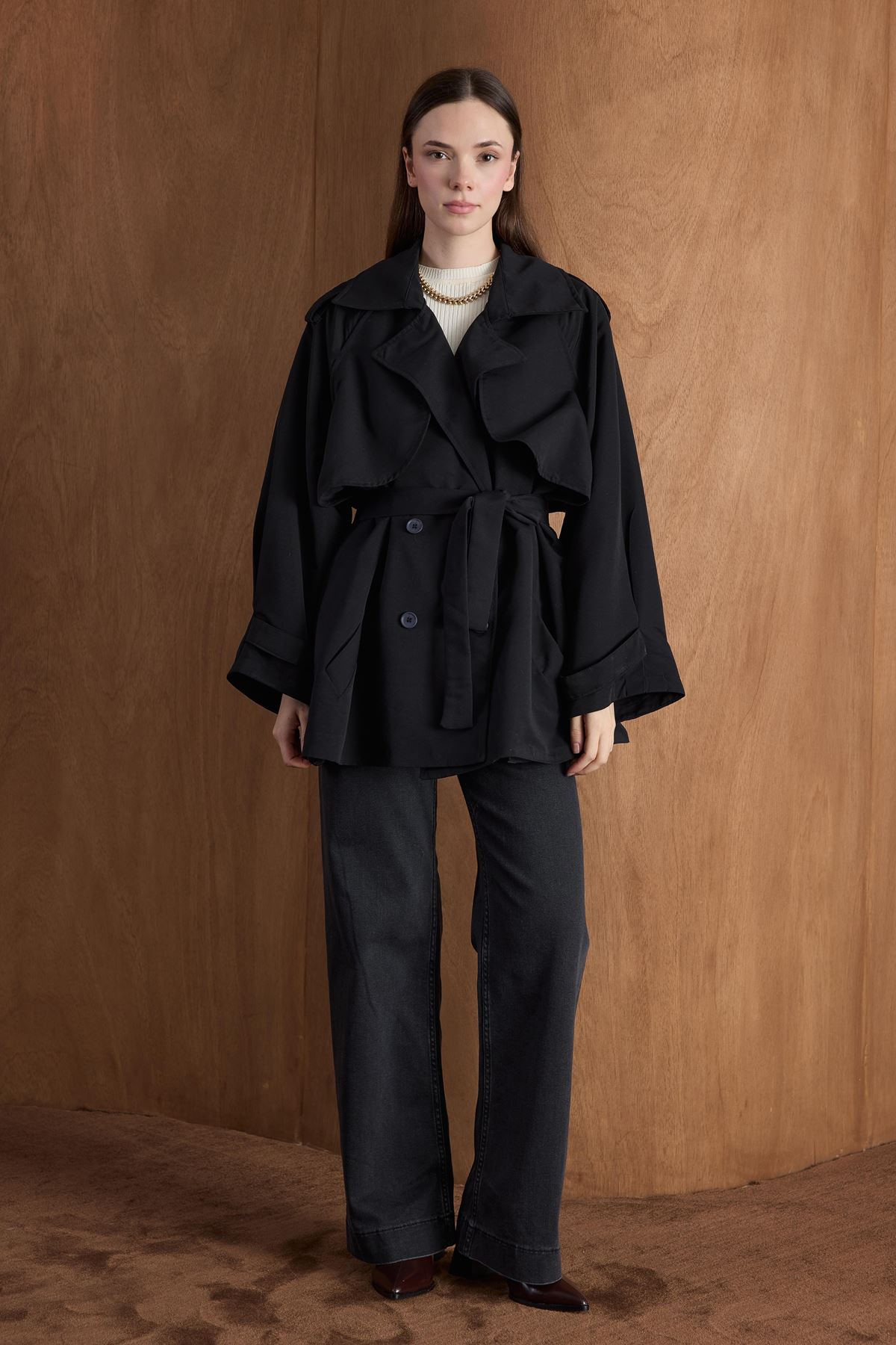 Detay: Kuşaklı bel, pelerin detay, geniş yaka, çift sıra düğme kapama