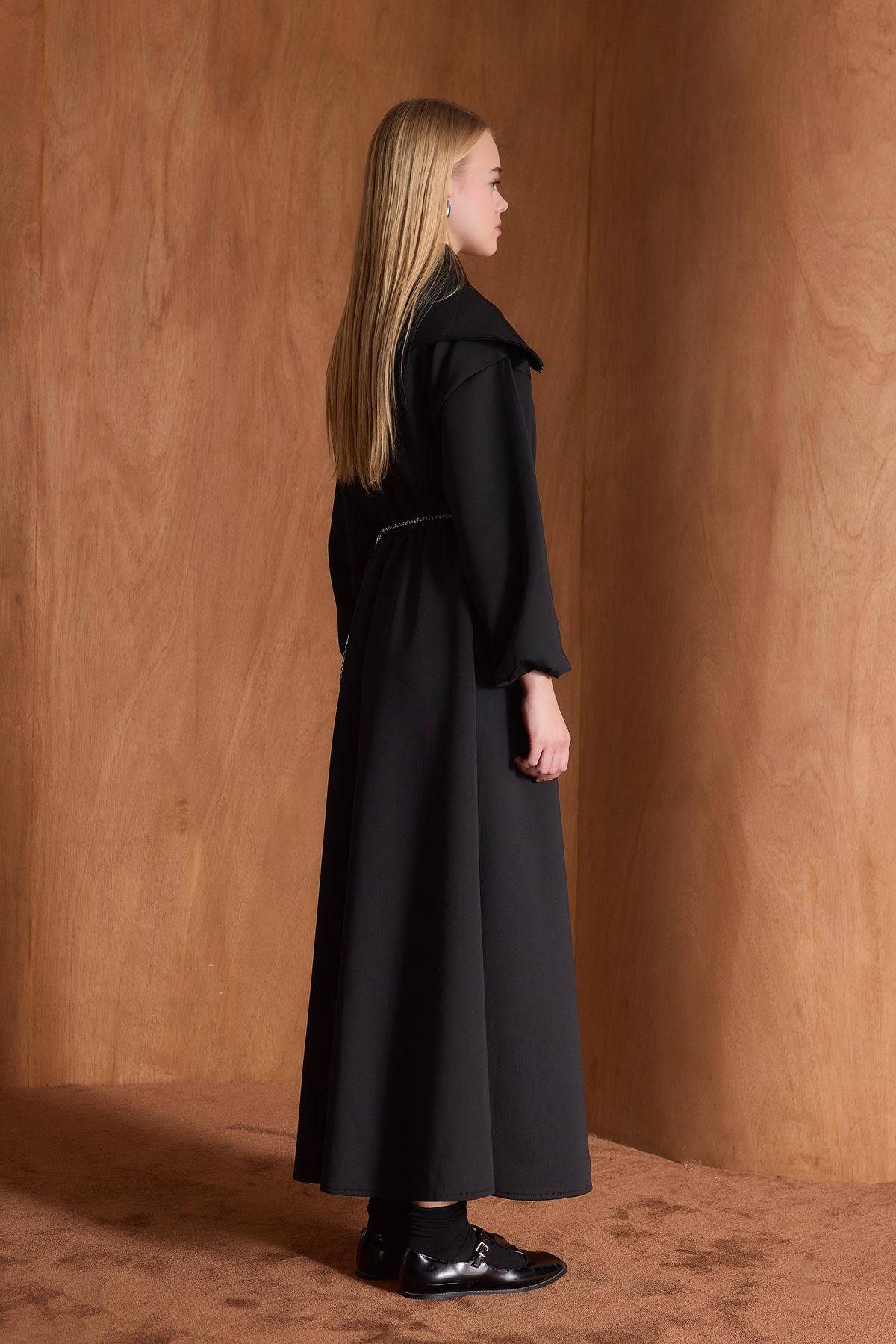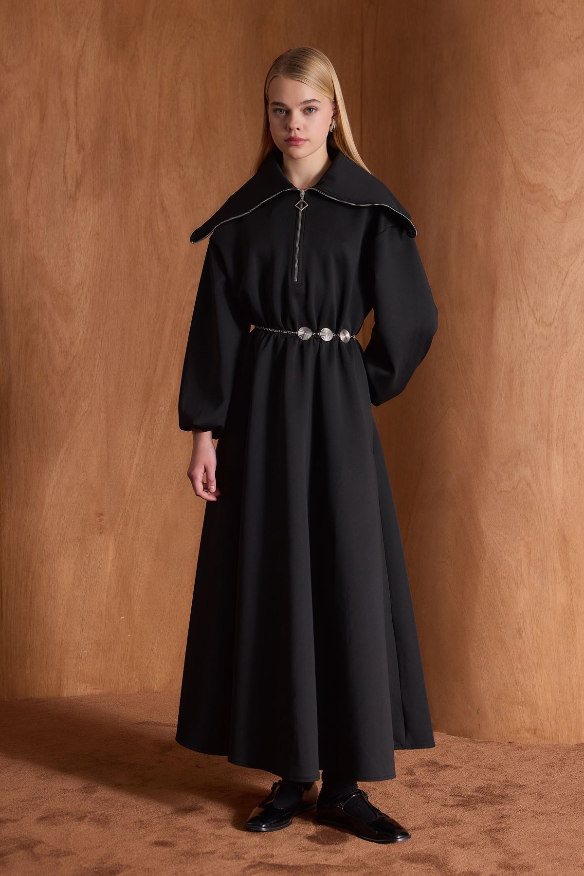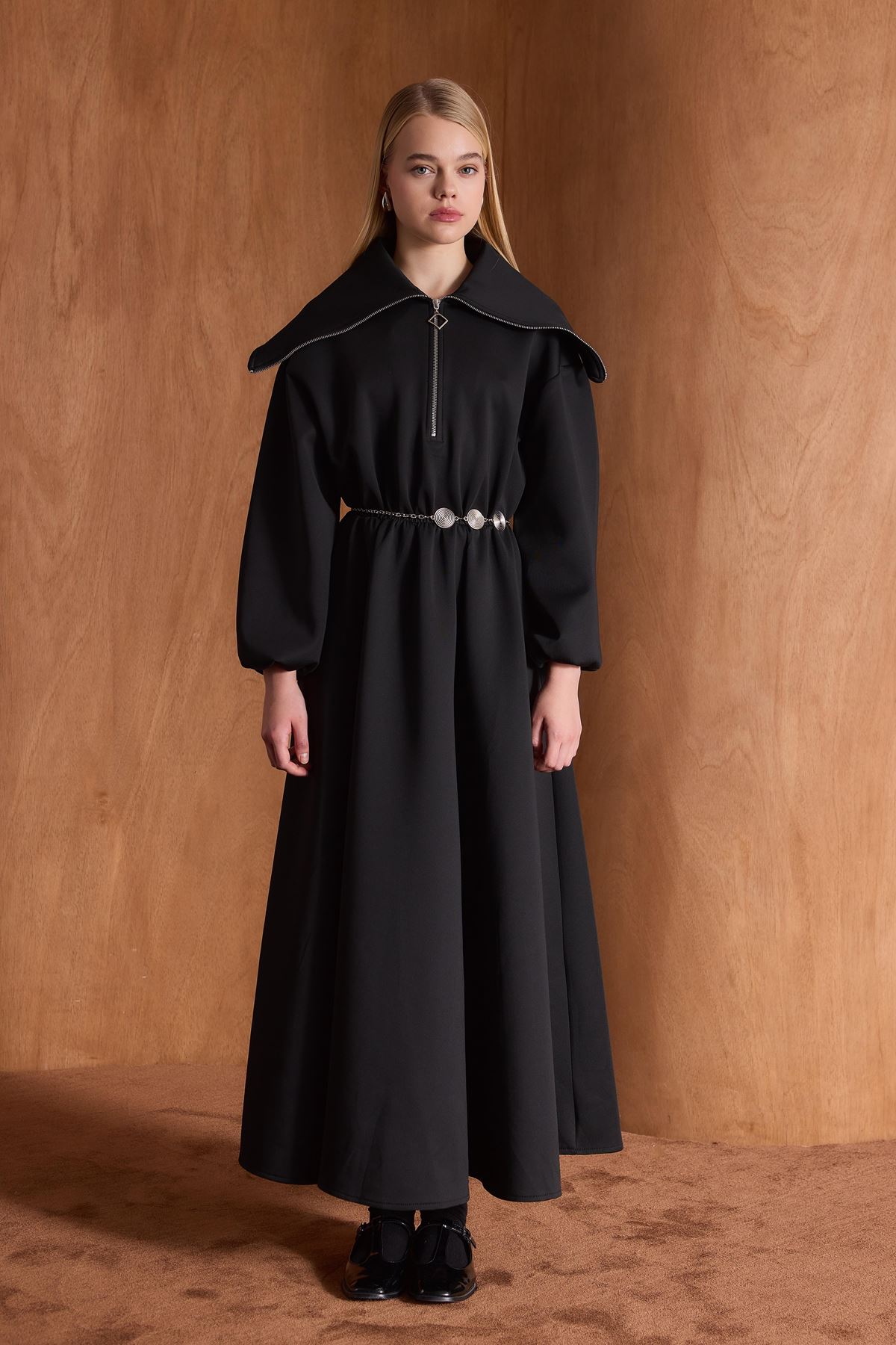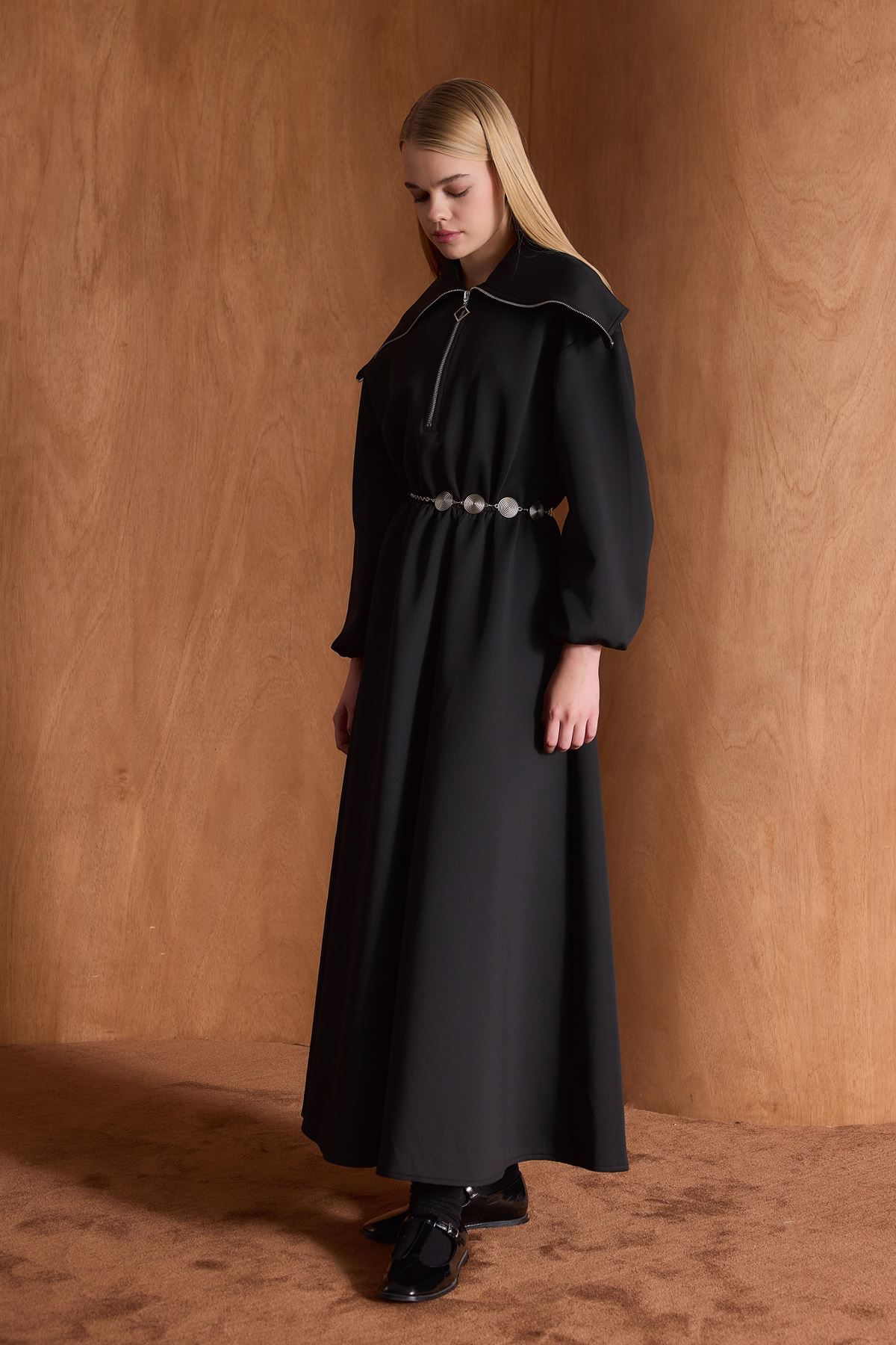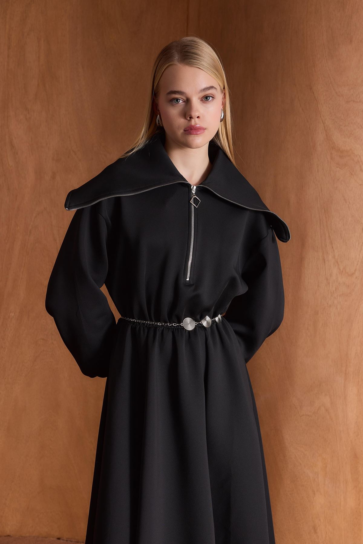 Güçlü duruşun sade şıklıkla birleştiği bu özel tasarım, modern çizgileriyle zarafeti vurguluyor. Bel kısmındaki metalik aksesuarlar elbiseye hareket katarken, geniş yakası ve yarım fermuar detayıyla sportif bir şıklık sunar. Scuba kumaşın tok ve düzgün duruşu, formunu korurken vücudu zarifçe sarar. Siyahın zamansız asaletiyle dikkat çeken bu parça, hem günlük şıklık hem de özel anlar için sofistike bir tercih sunar.