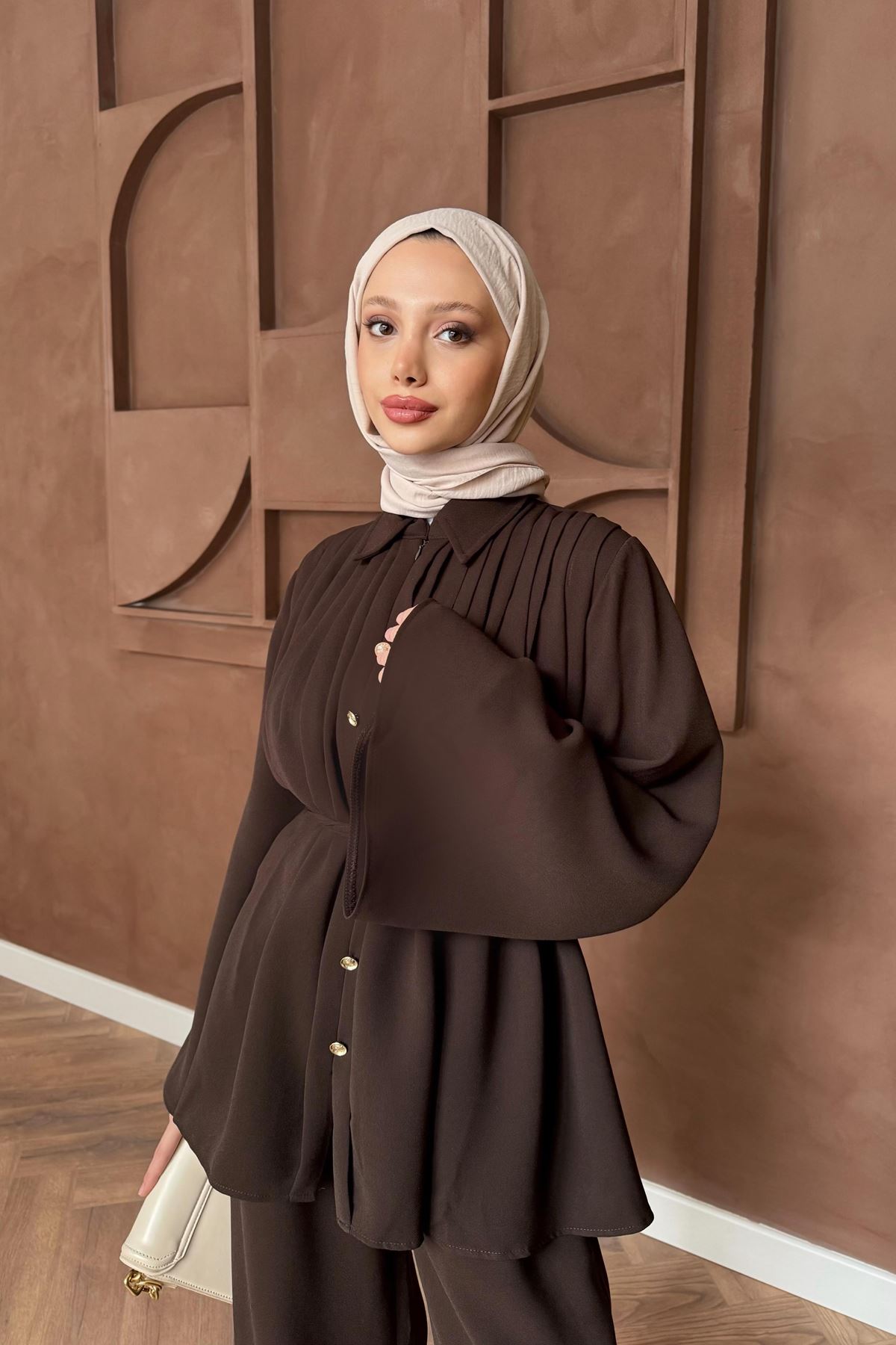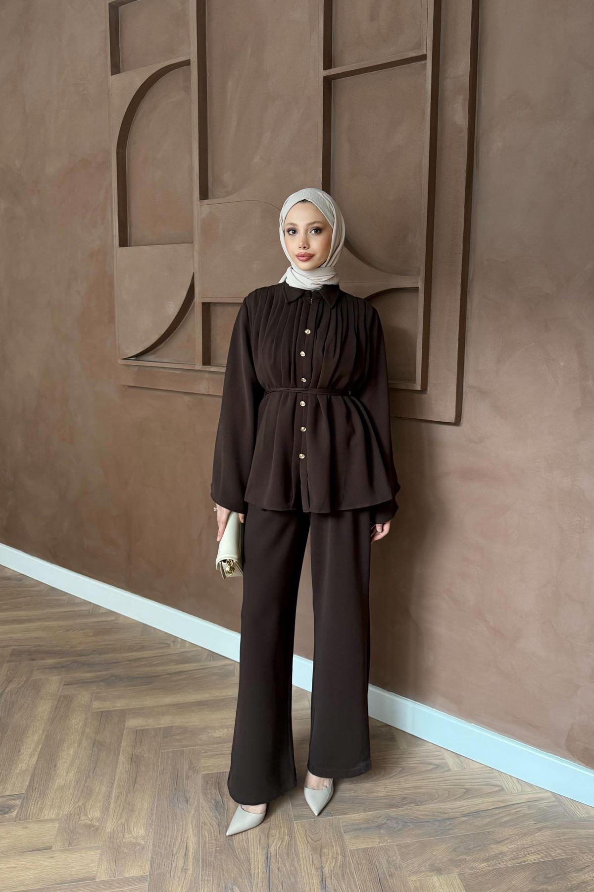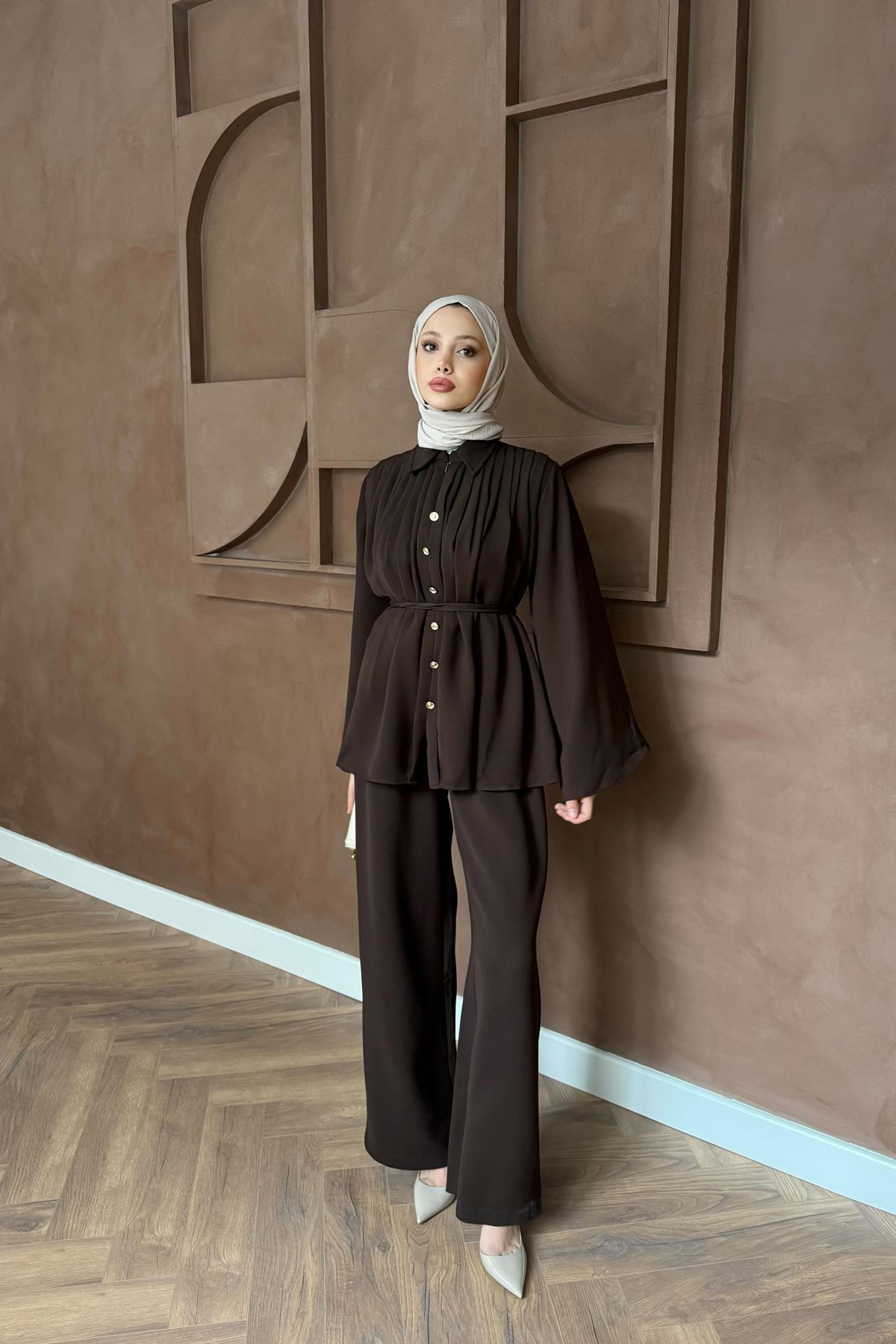Pileli Pantolonlu Takım - Kahve
