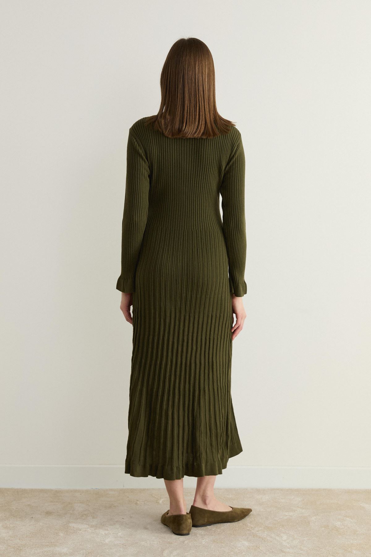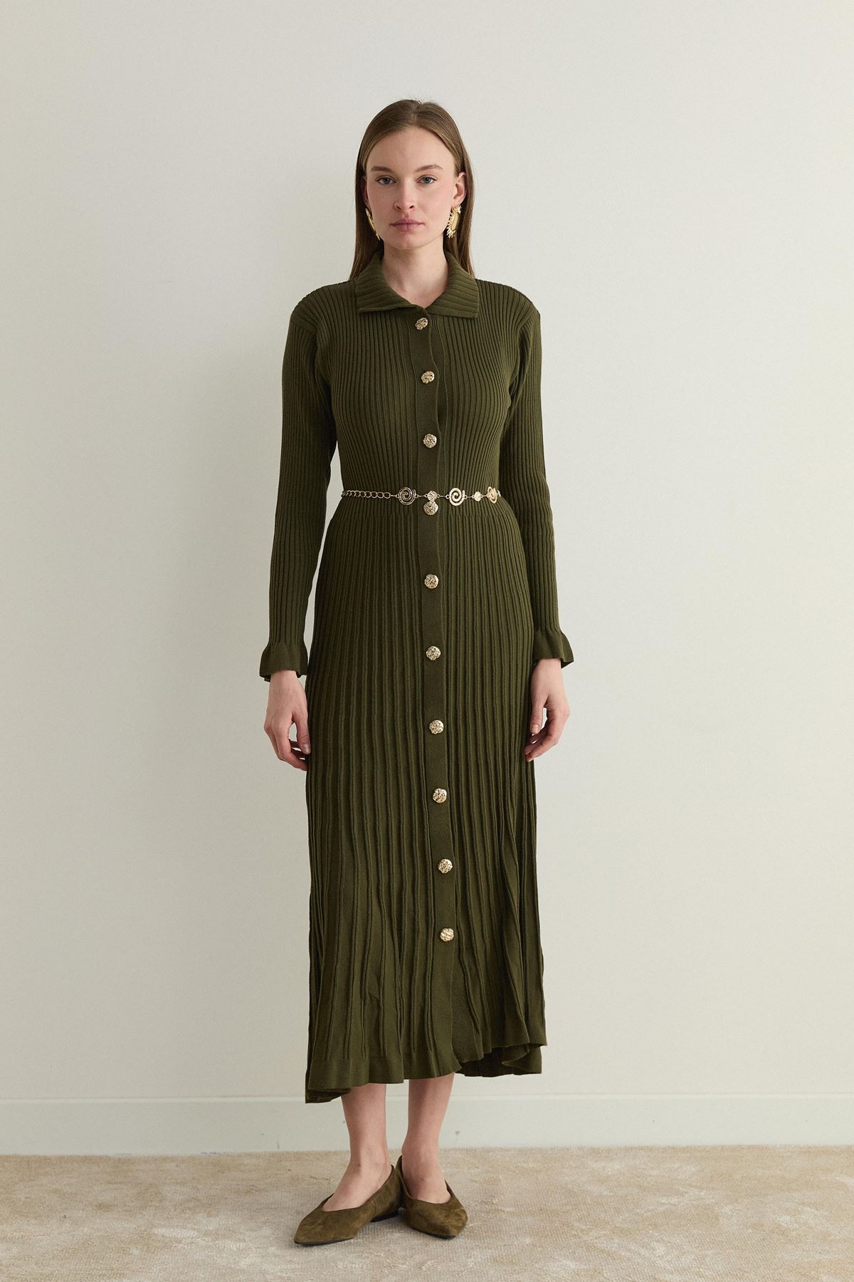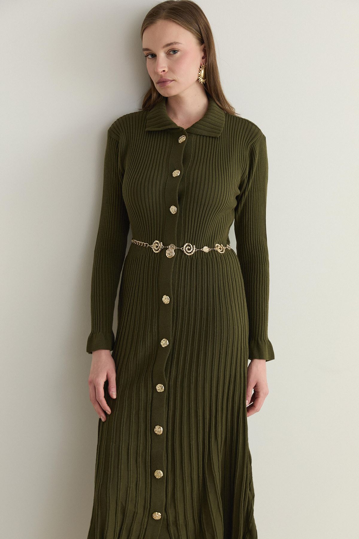 Nellie Gold Düğmeli Kemerli Triko Elbise-Haki