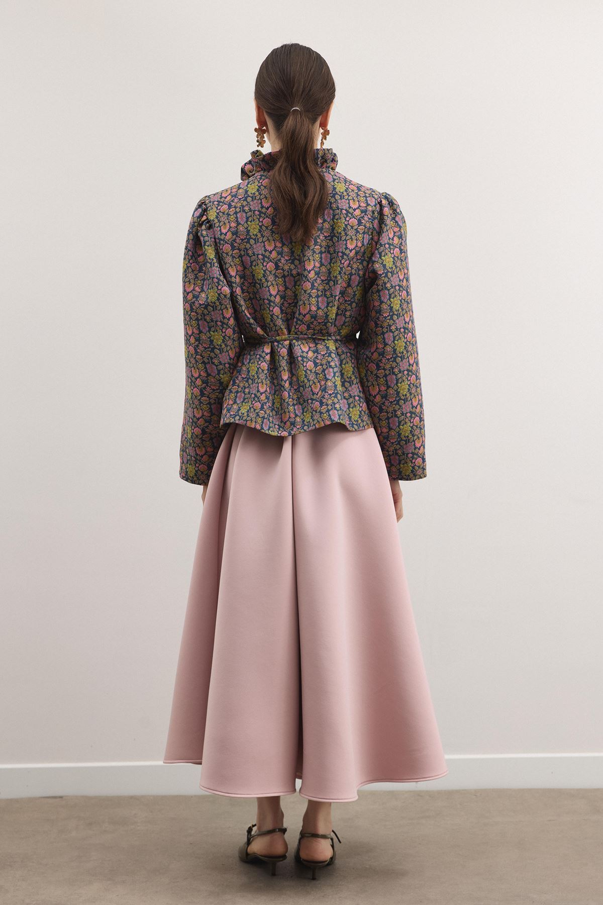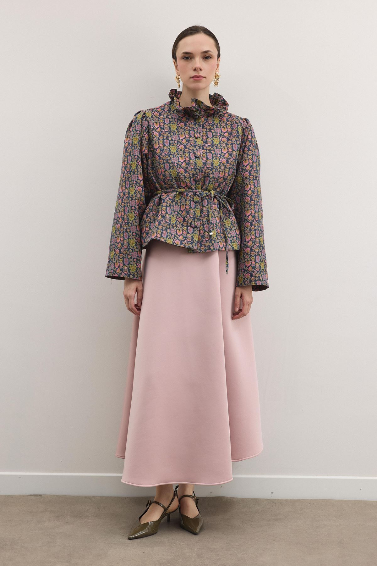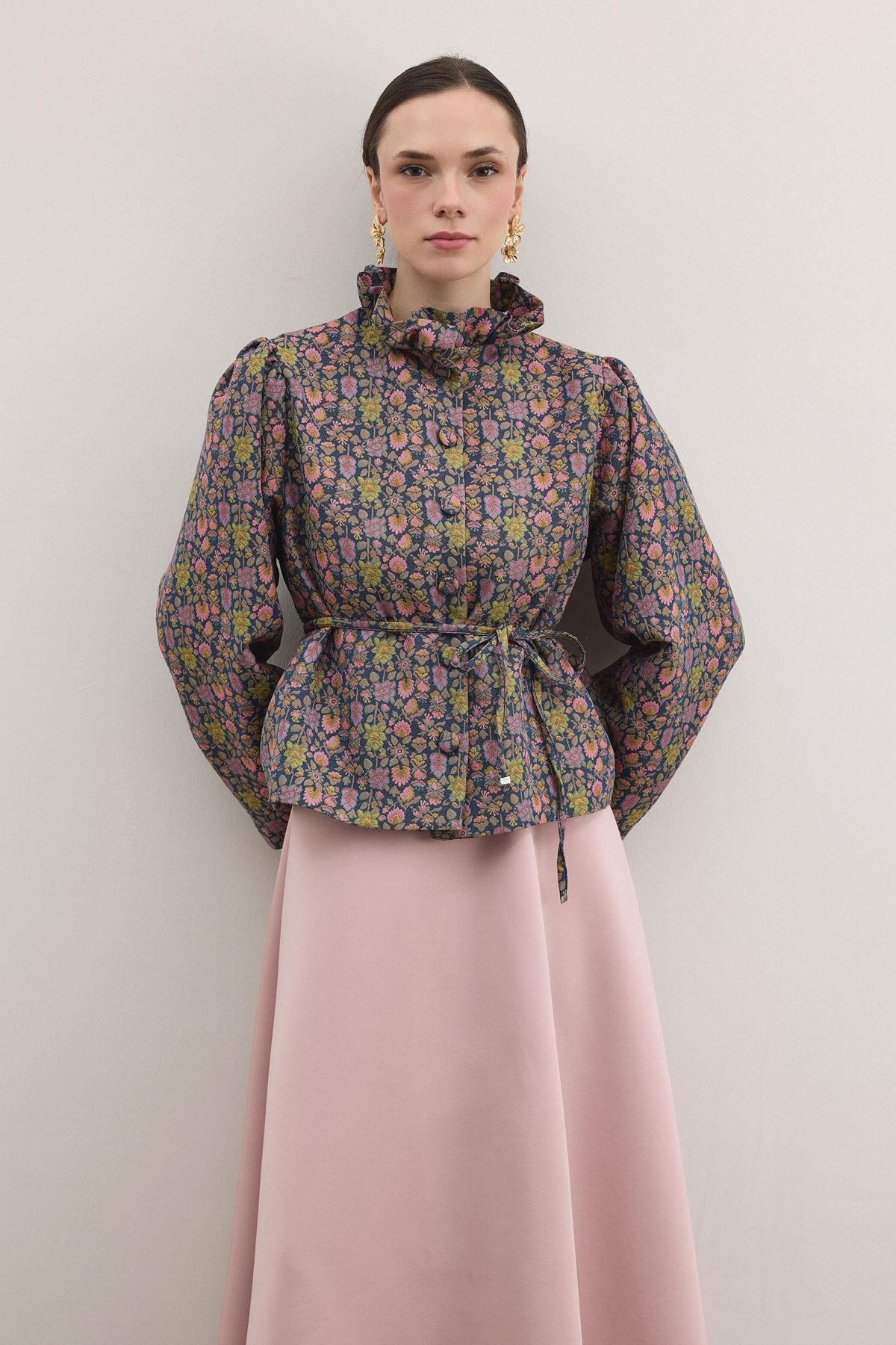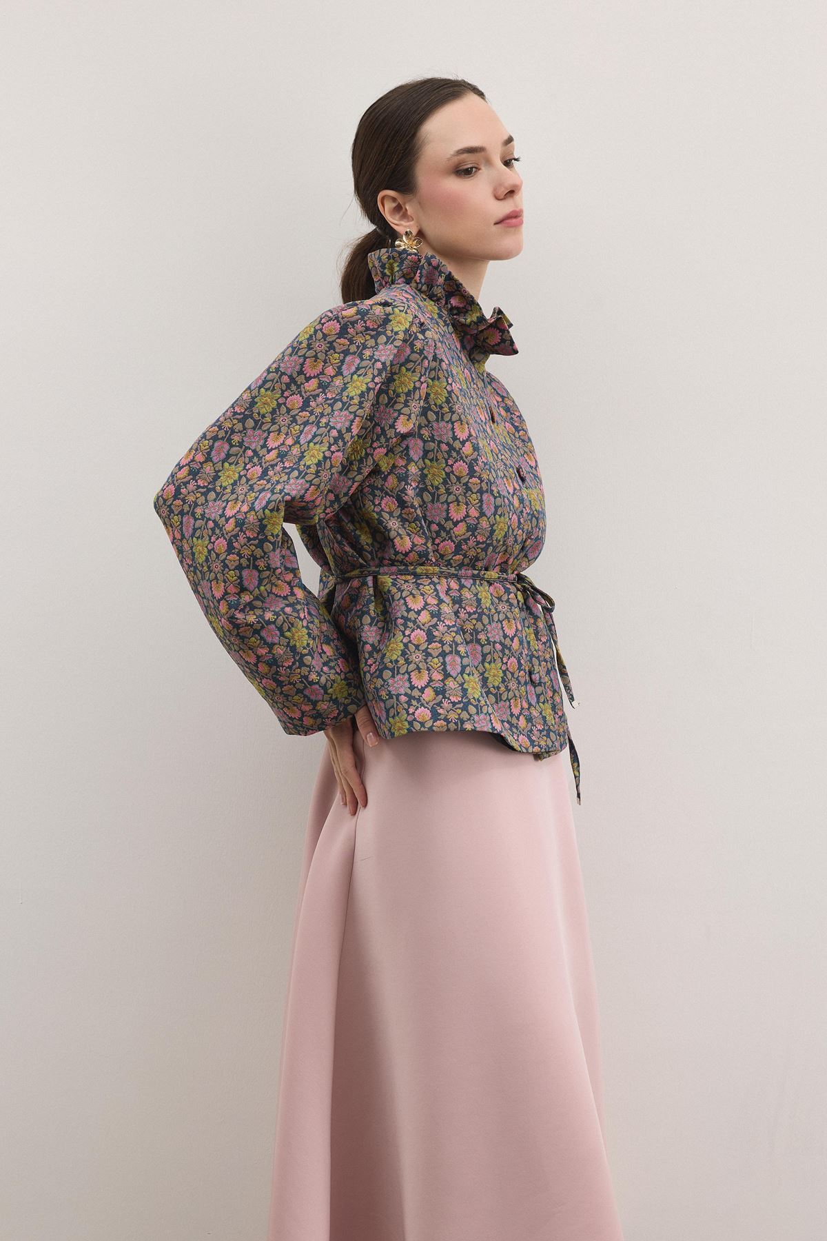 Detay: Fırfırlı dik yaka, uzun kol, kemer detaylı bel, floral desenli jakar kumaş
