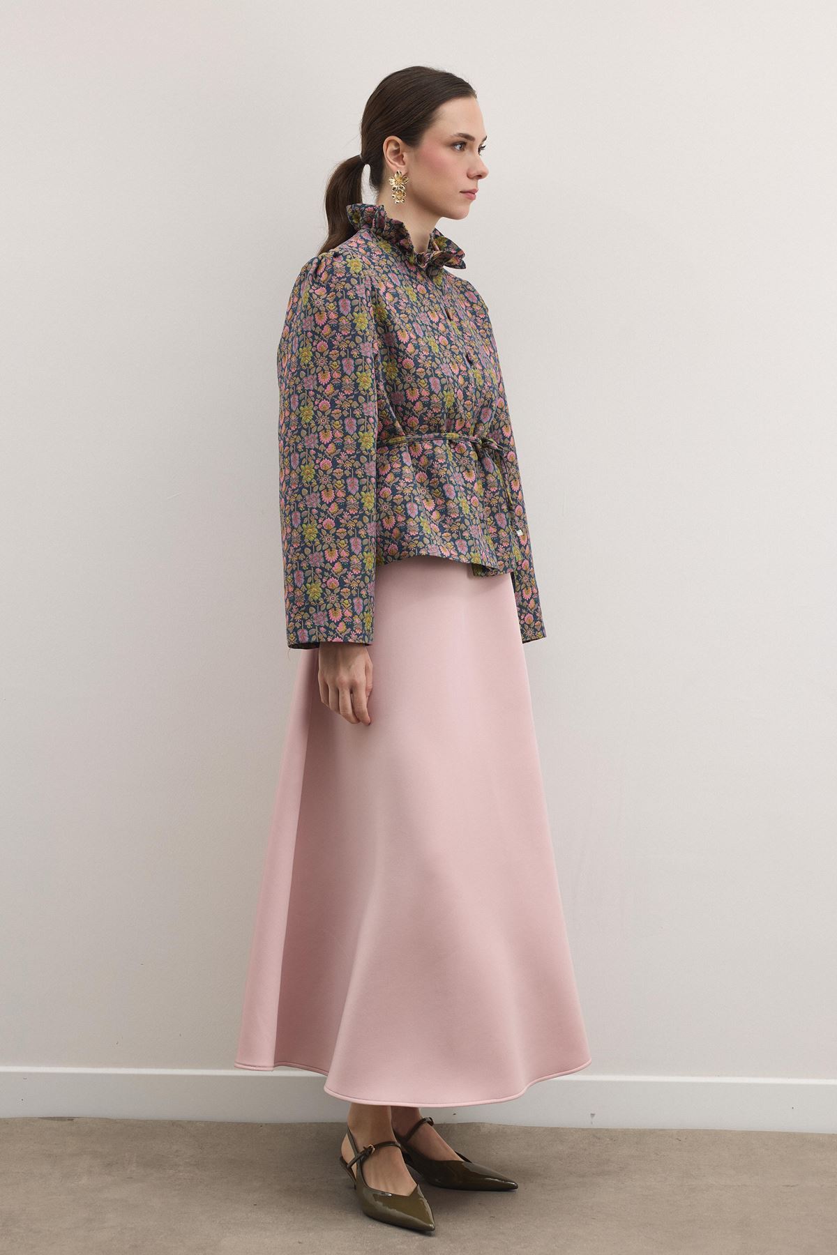 Zarif jakar dokusu ve romantik floral deseniyle dikkat çeken bu parça, fırfırlı yakası ve belden bağlama detayıyla feminen bir siluet oluşturur. Astarlı yapısı sayesinde konforlu bir kullanım sunarken, özel davetlerden günlük şıklığa kadar her ortamda stilinizi öne çıkarır.