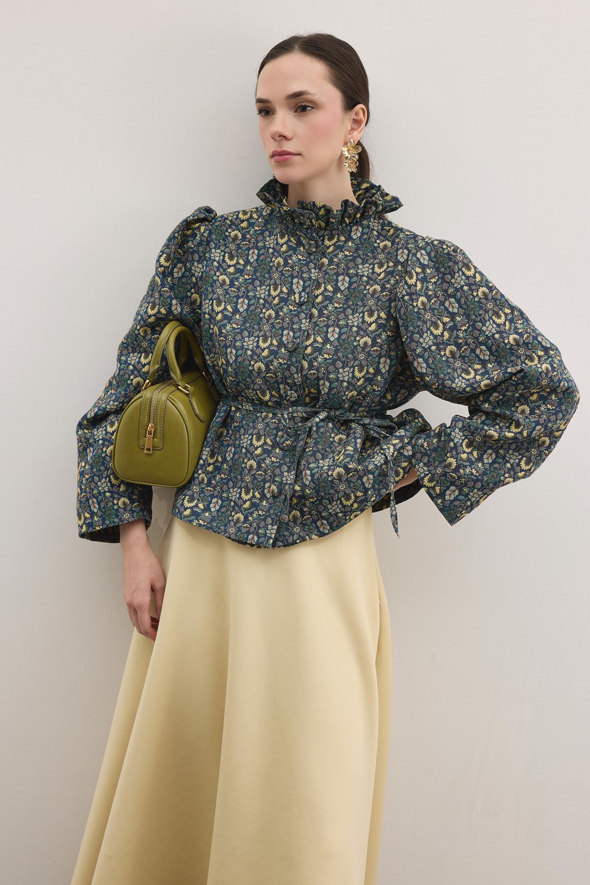 Ürün Özellikleri Kumaş Türü: Jakar İçerik: %100 PES Boy: 60 cm Astar: Astarlıdır Kalıp: Normal fit Detay: Fırfırlı dik yaka, uzun kol, kemer detaylı bel, floral desenli jakar kumaş Yıkama ve Ütüleme Talimatı 30°C’de hassas yıkama yapılması tavsiye edilir. Ağartıcı kullanılmaz. Düşük ısıda ütüleme yapılmalıdır. Kuru temizleme yapılabilir. Tamburlu kurutma önerilmez. Ürün Açıklaması Zarif jakar dokusu ve romantik floral deseniyle dikkat çeken bu parça, fırfırlı yakası ve belden bağlama detayıyla feminen bir siluet oluşturur. Astarlı yapısı sayesinde konforlu bir kullanım sunarken, özel davetlerden günlük şıklığa kadar her ortamda stilinizi öne çıkarır.