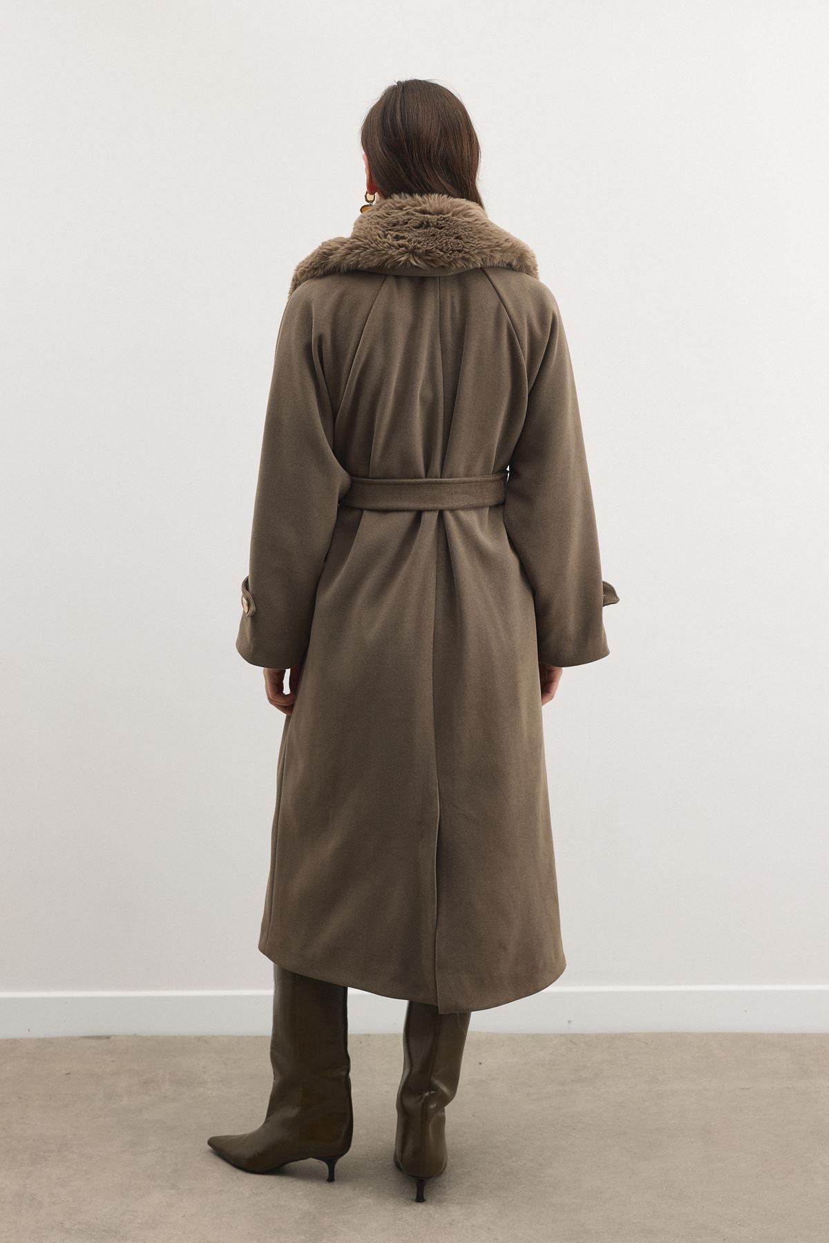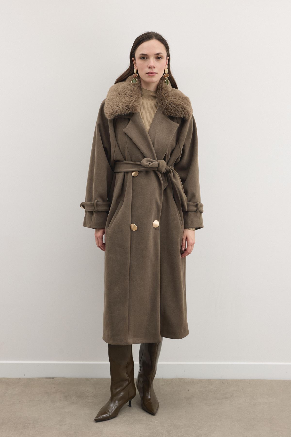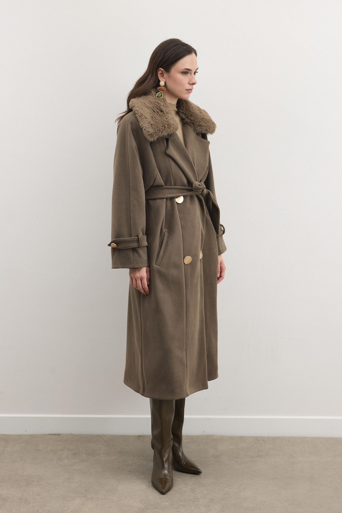 Detay: Kuşaklı bel, büyük düğme detayları, geniş yaka formu, uzun kesim