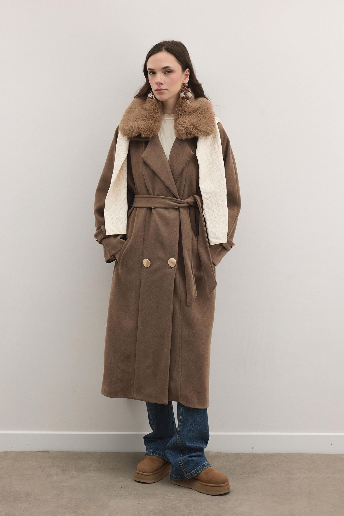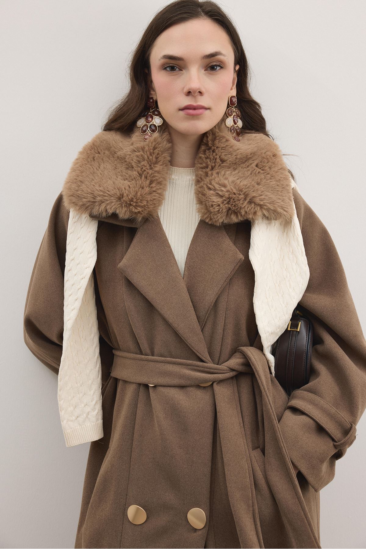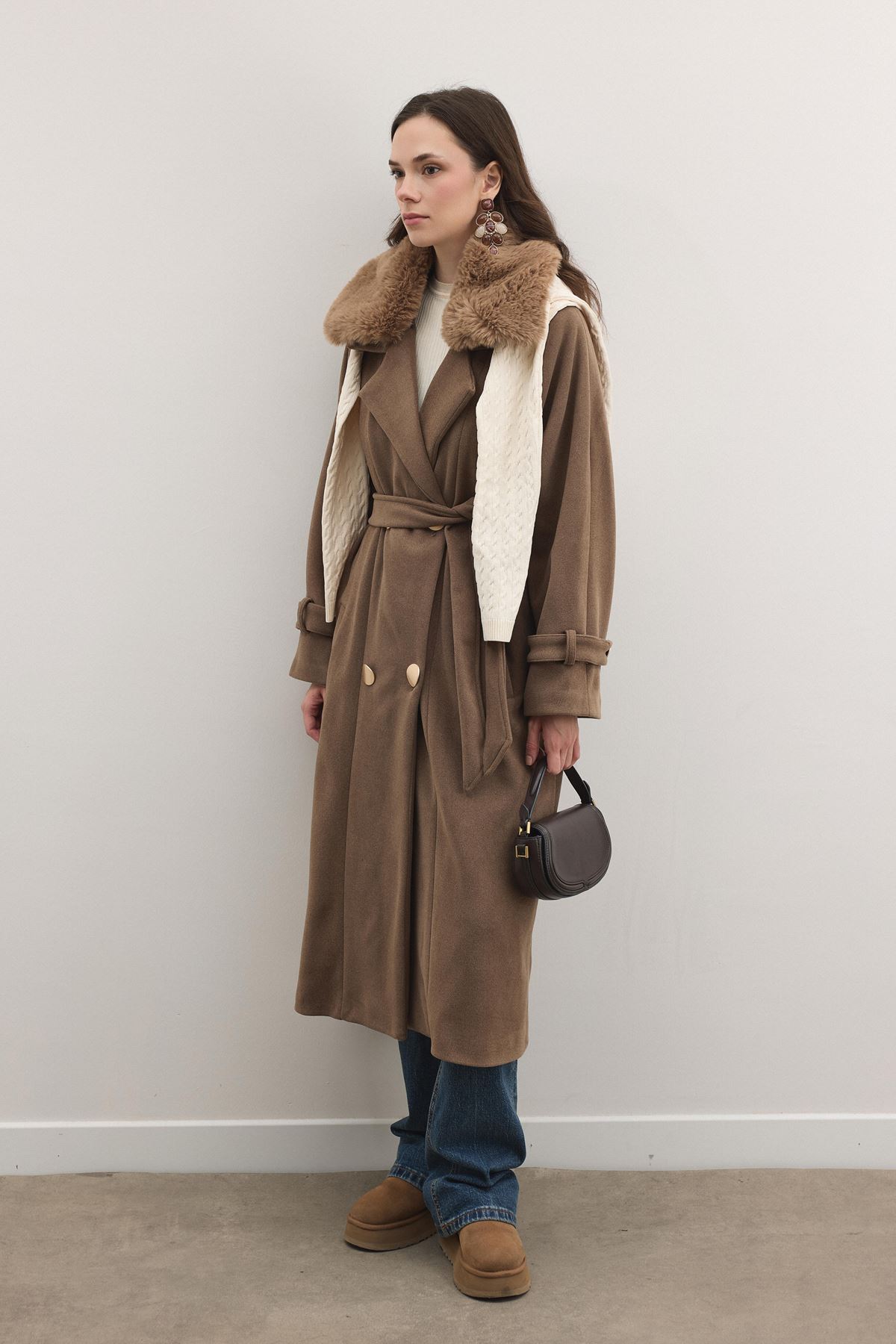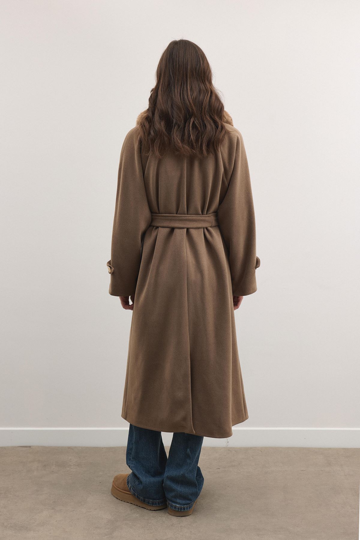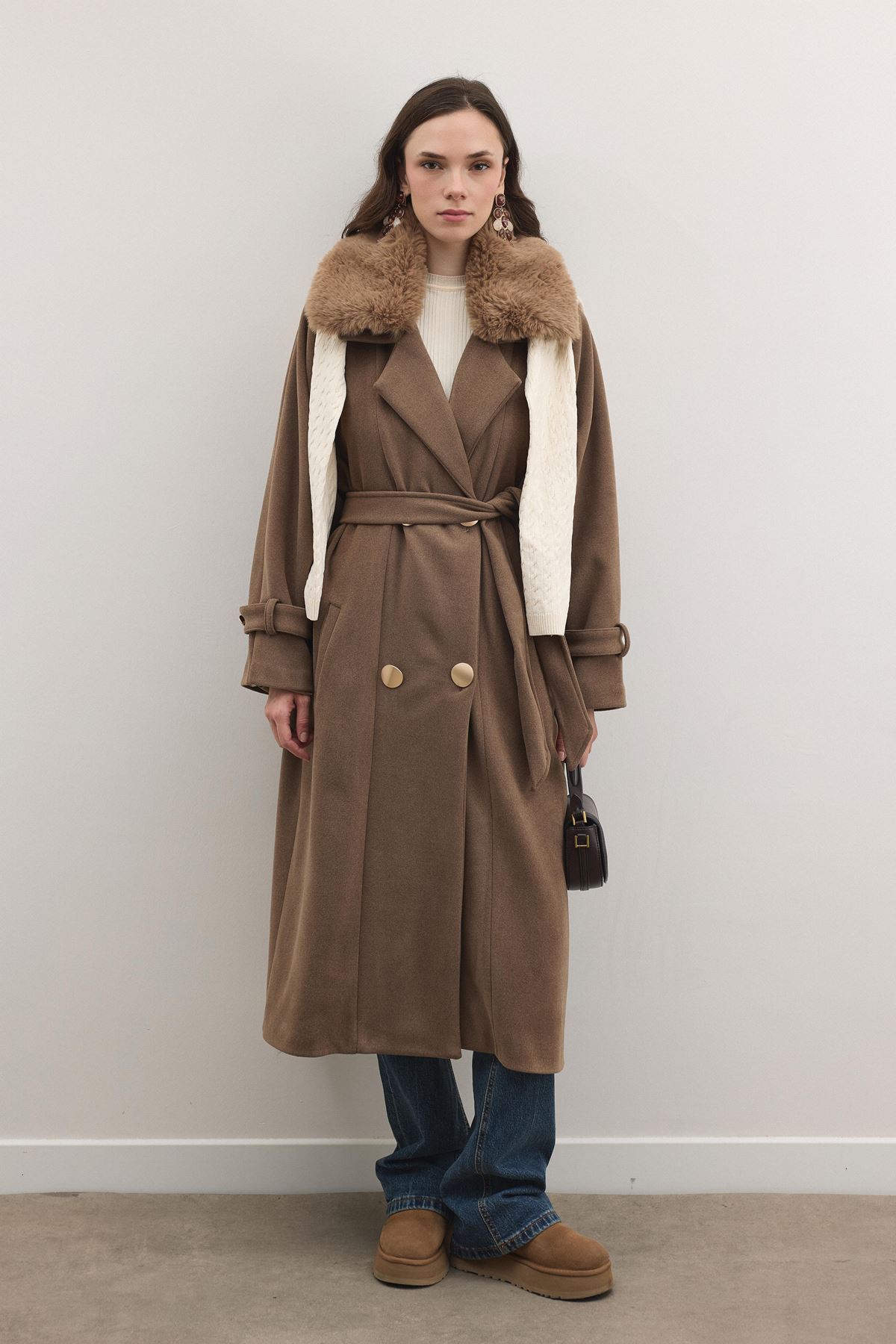 Luna Yaka Kürklü Uzun Kaşe Kaban - Kahve
