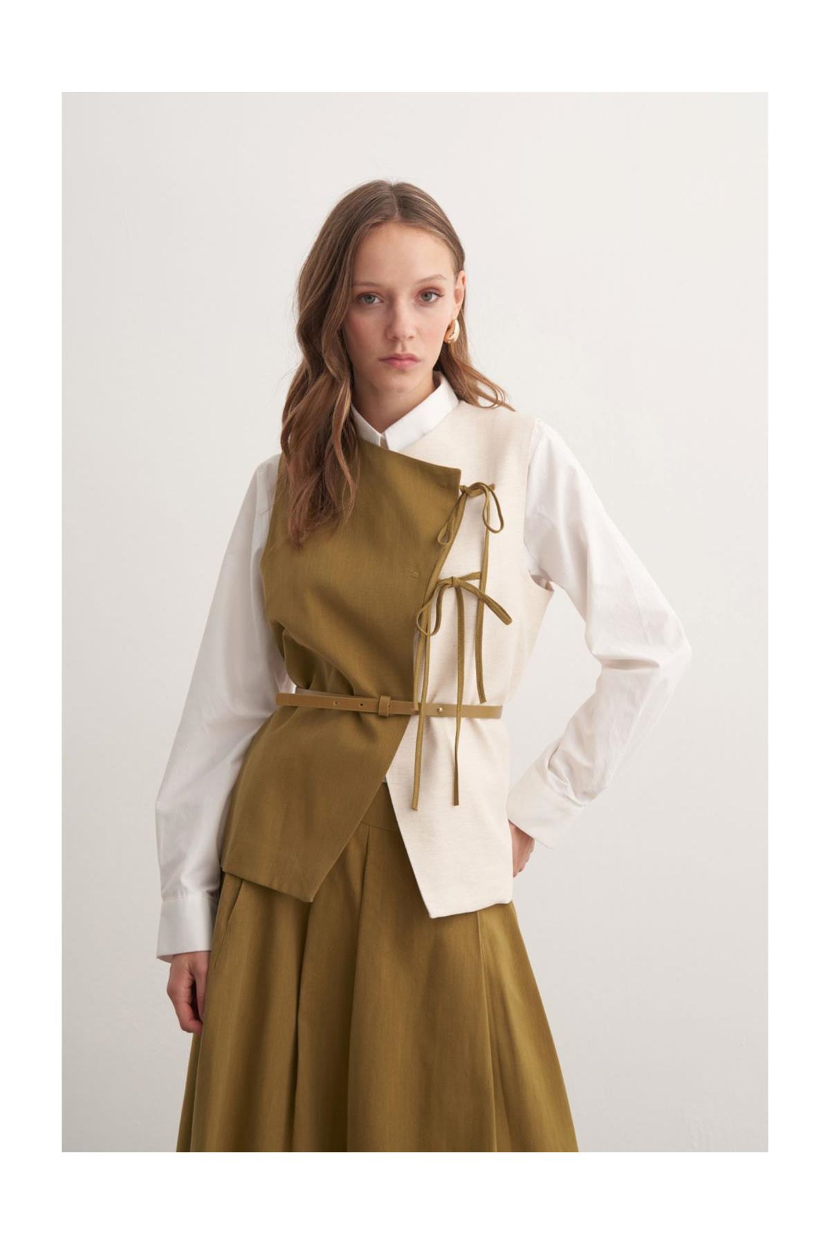 Takım Keten kumaştan üretilmiştir. Yeleğin ön iç kısmı gizli düğmelidir.Göğüs kısmı ip bağlama detaylıdır. Eteğin arka kısmı lastikli ve yandan fermuarlıdır.